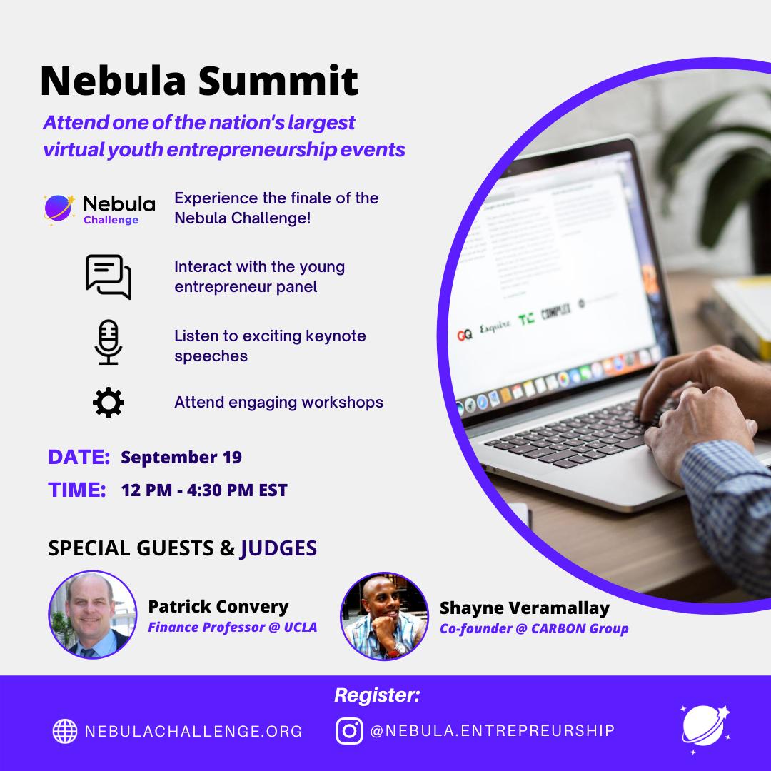 The Nebula Summit is a grand event designed to inspire and help the youth dive into the world of entrepreneurship! Whether you're just interested in the idea of your own company or already on your way to creating one, our handpicked speakers, workshops, and panelists will give valuable tips to navigate the startup world. Moreover, the Summit is the culmination of the Nebula Challenge - experience 10 amazing teams of youth entrepreneurs and their golden startup ideas! We'd love maximum attendance, so please spread the flyer amongst any entrepreneurial friends you might have.